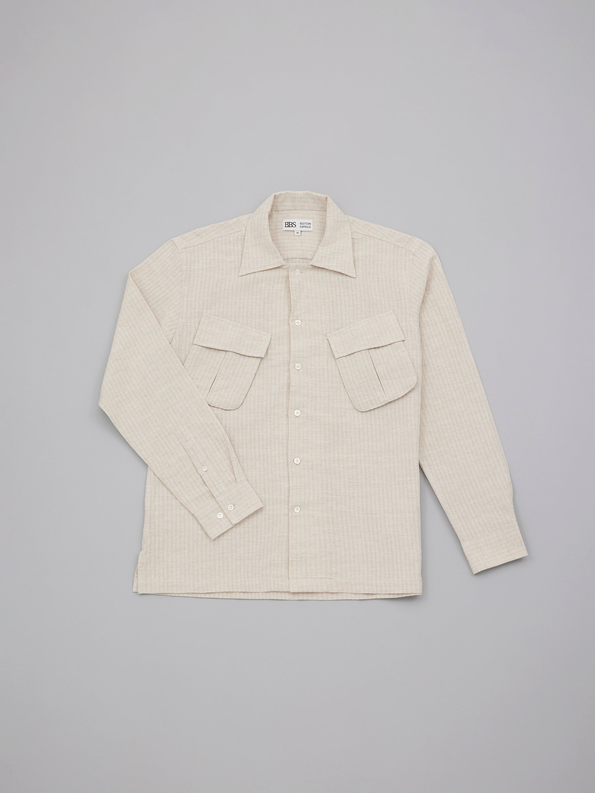Inspired by the classic jungle jacket, this piece reinterprets the utilitarian staple as a lightweight shirt. Retaining its signature patch pockets and functional character, it is refined as a shirt with a softer structure and relaxed proportions for everyday wear. Made from Japanese herringbone linen.